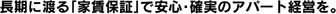 | 万が一、火災や盗難といった事故が発生した際は、当社が「現場調査」「近隣、入居者対応」「保険手続き」「原状回復修理」までの一切を迅速に対応致します。 |